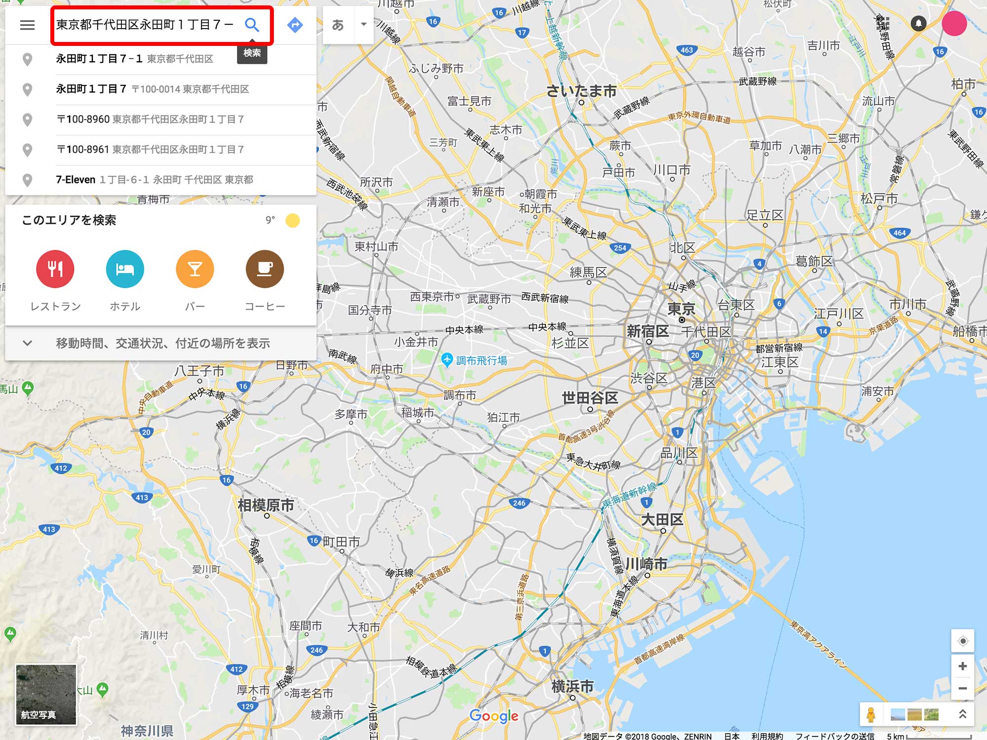 - 画面左上の入力フォームに住所(例:東京都千代田区永田町1丁目7-1)を入力し、横の「虫眼鏡」ボタンを押します。