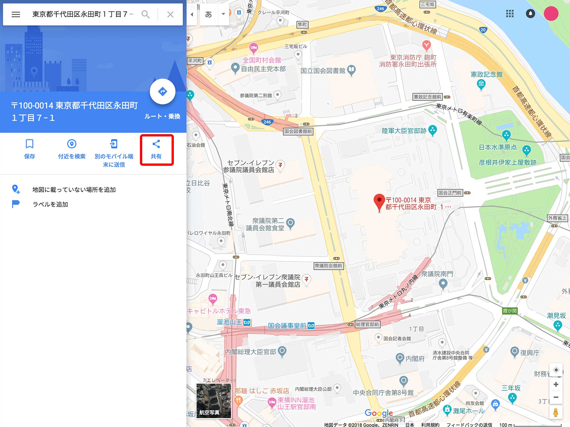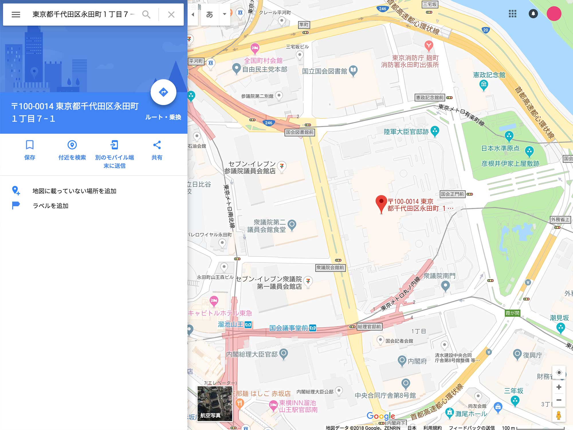 今回は「国会議事堂」の住所をサンプルとして使っています。