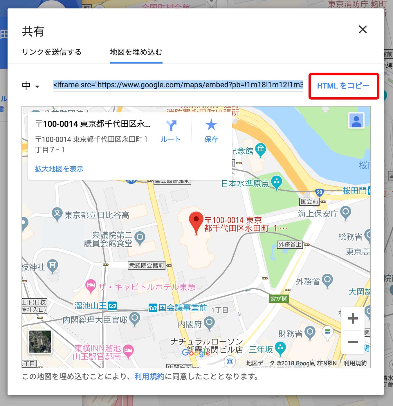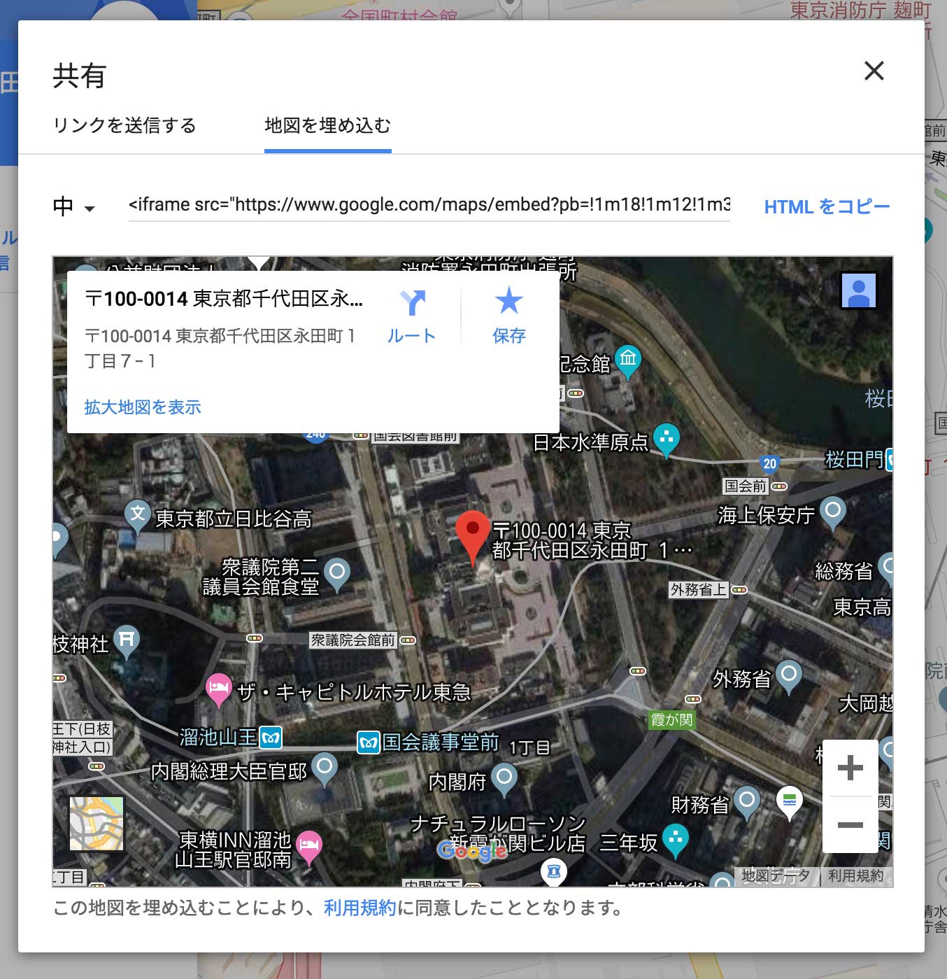 今はGoogleアカウントにログインしていないとマップのhtmlが出力されないようです。ログインしていると必ず出る表示なので、気にせず進みましょう。 - 「HTMLをコピー」をクリック。