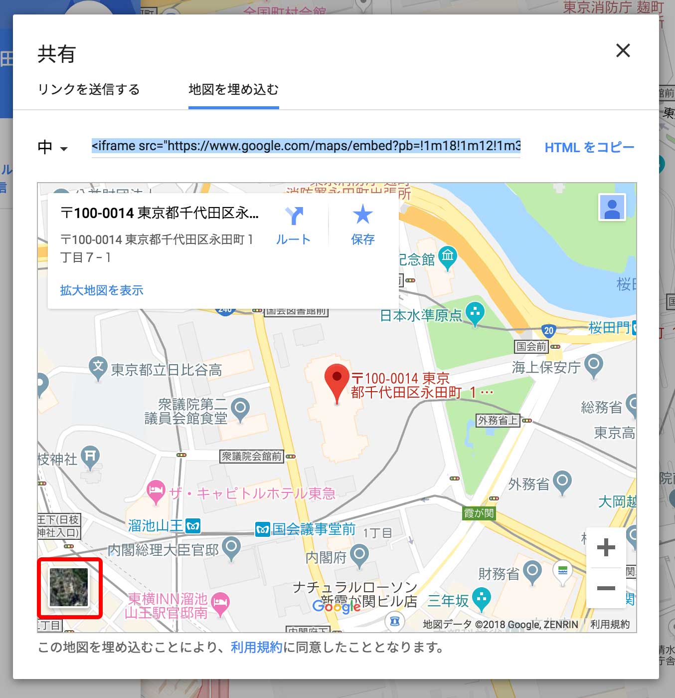 - 出てきた小ウィンドウから、「地図を埋め込む」タブをクリック。