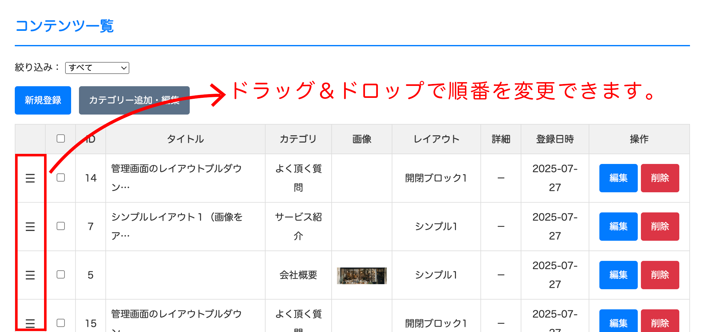 テーブル一番左の3本バーをドラッグ&ドロップすることで順番を簡単に変更できます。 - 簡易フォームについて。
