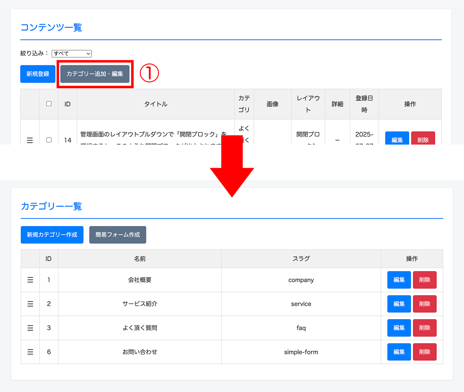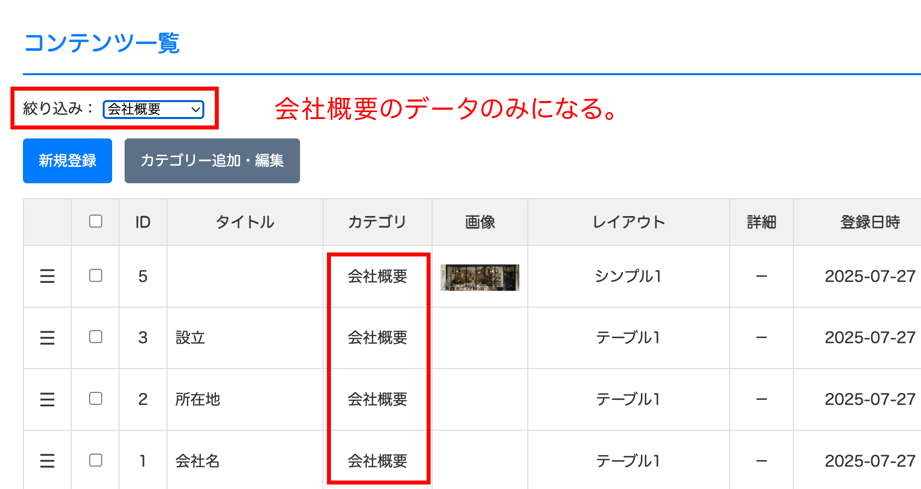 デモでは「会社概要」「サービス紹介」「よく頂く質問」「お問い合わせ」の4つのカテゴリーが設定されています。
