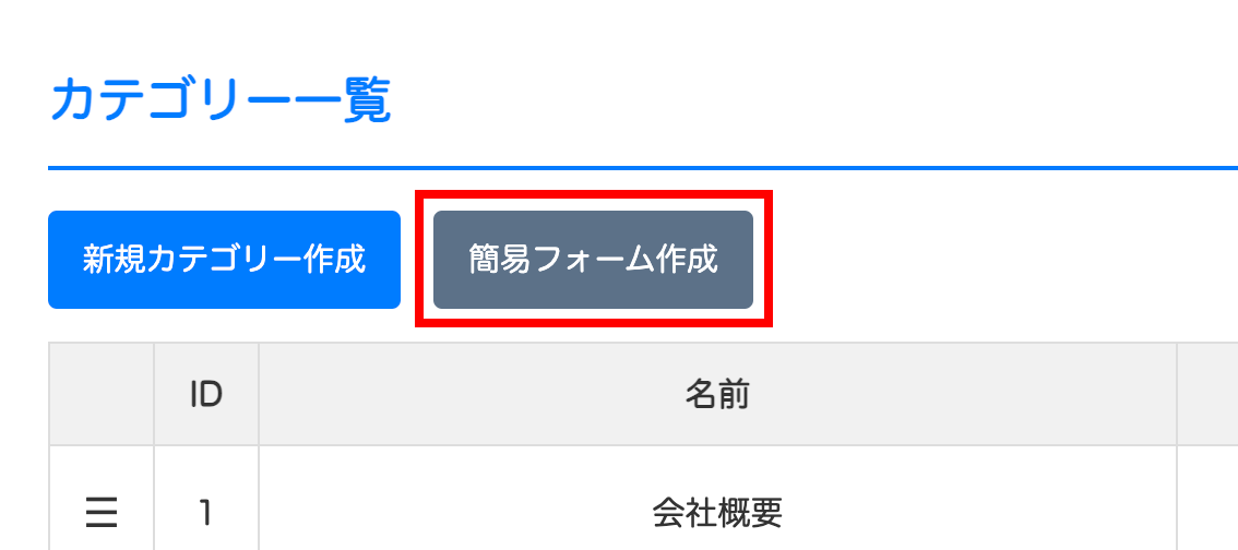 上で解説したカテゴリー一覧ページに「簡易フォーム作成」というボタンがあります。