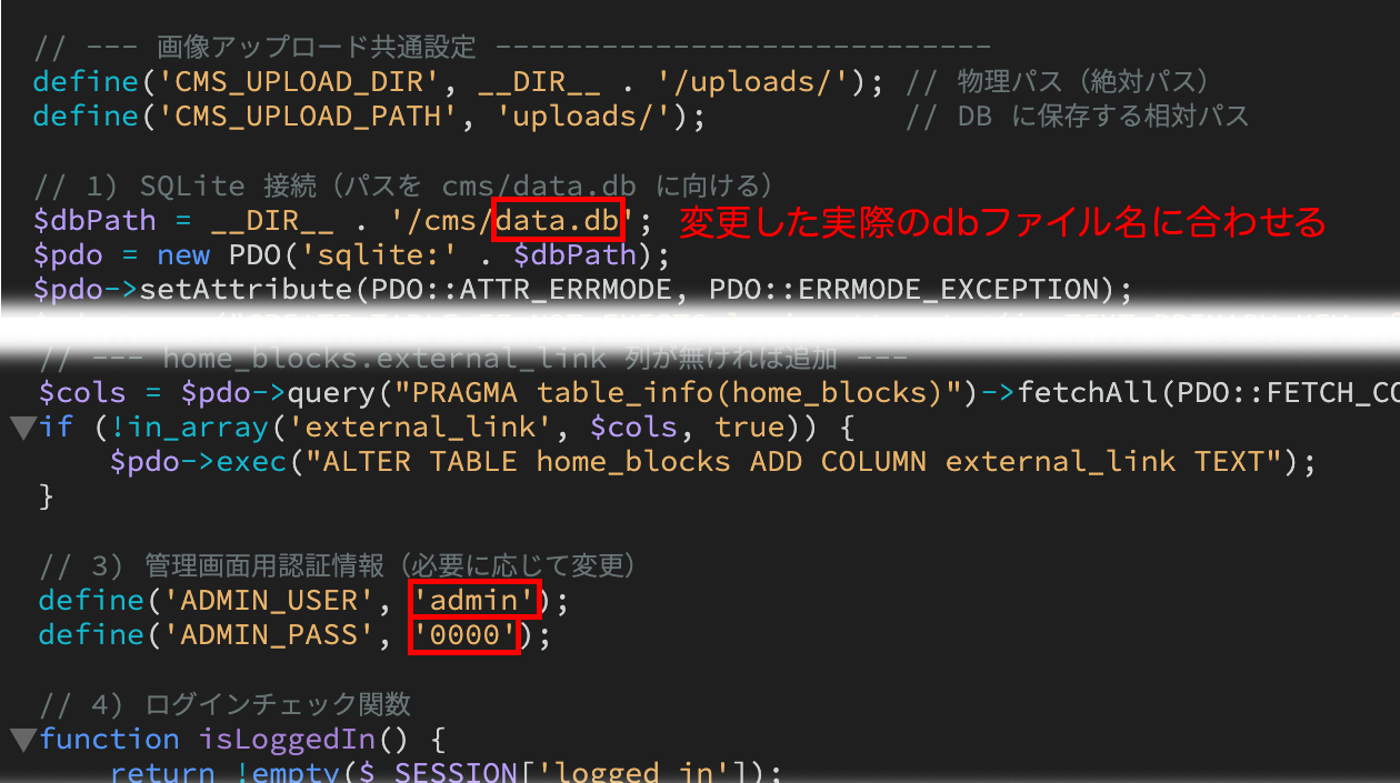 ※実際にCMSを導入される場合、IDとパスワード は「必ず」入れ替えて下さい。また、cmsフォルダ内にある data.dbのファイル名 も「必ず」変更して下さい。いずれも config.php で設定できます。これらは不正アクセス防止用なので「必ず」行って下さい。