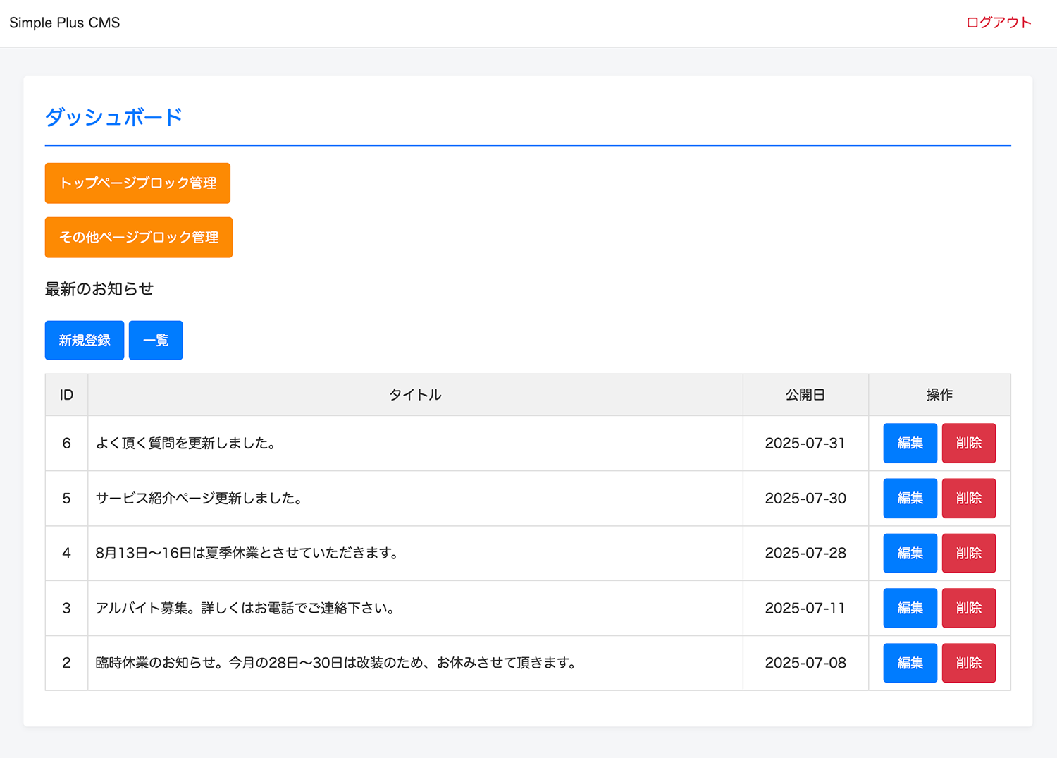 サンプルデータが登録されていますので、編集や削除をしてみて下さい。もちろん新規登録もできます。