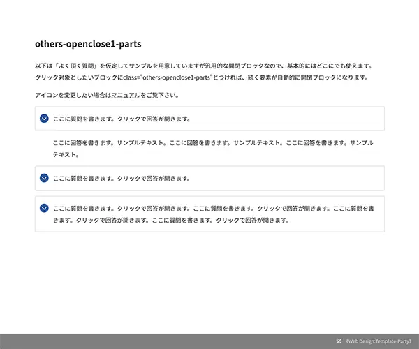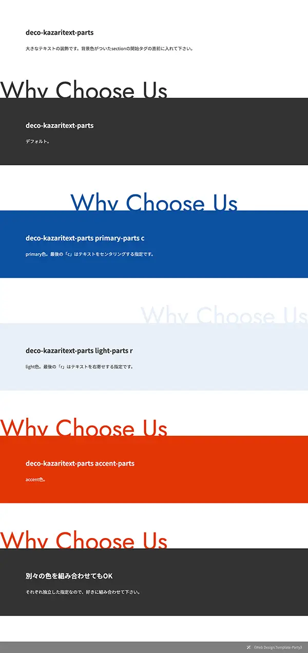 - 黒、青、白、オレンジのカラーは、theme.cssの :rootにしているカラーコードが適用されます。各パーツに直接カラーを指定してもOKだし、この :root のカラーコードを好みのテーマカラーに調整して頂いてもOK。