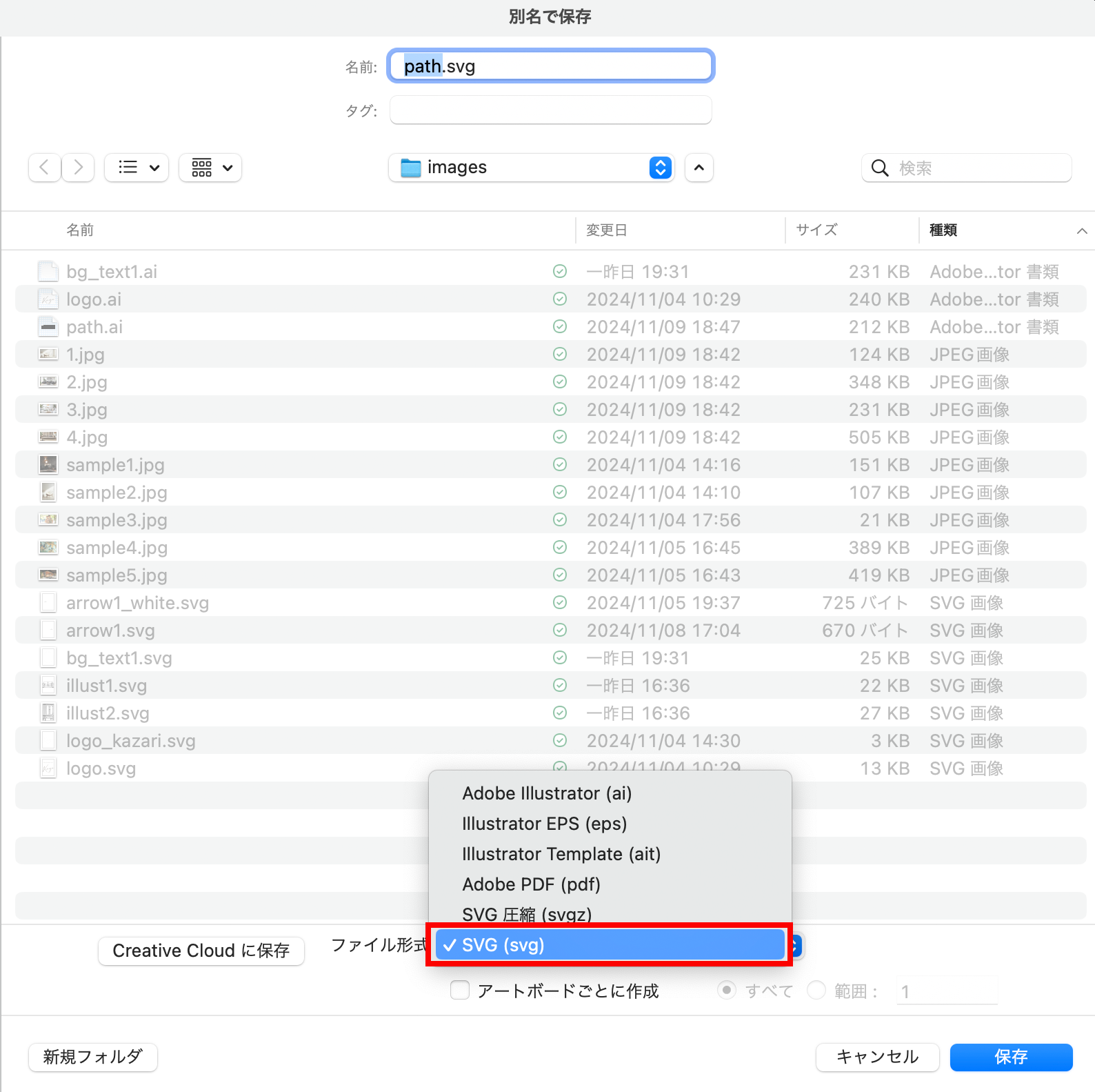 「ファイル」→「別名で保存」→ファイル形式のプルダウンから「SVG」を選びます