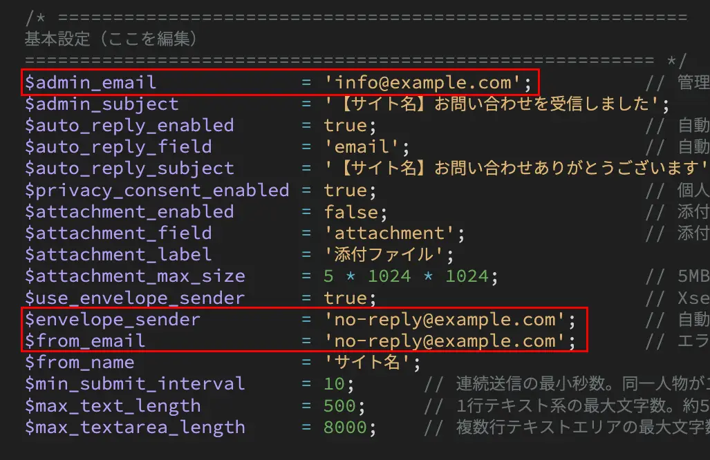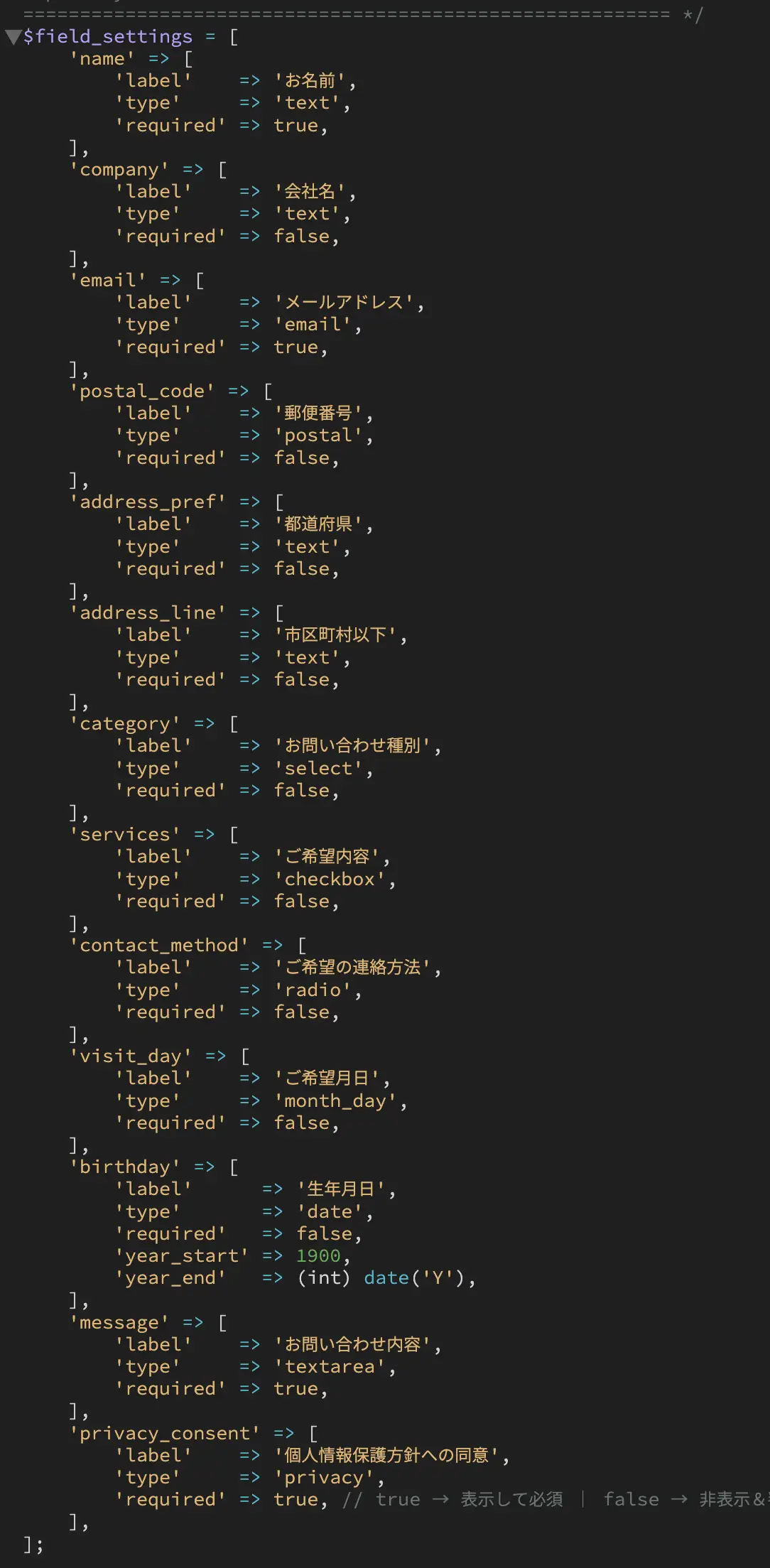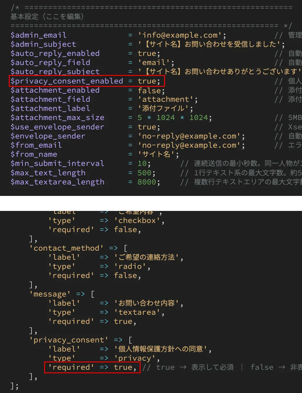 - 個人情報に同意するチェックボックスを出したい場合は、以下の2箇所(「$privacy_consent_enabled」と「$field_settings」内の「privacy_consent」)を true にします。使わない場合は false にします。