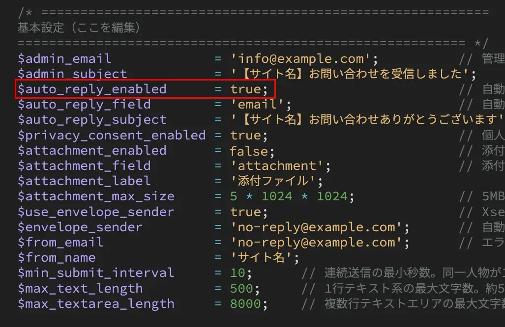 - 自動返信機能を使う場合は、以下($auto_reply_enabled)を true にします。使わない場合は false にします。