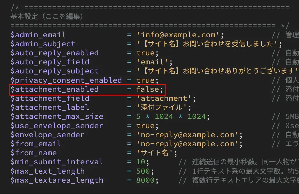 - 添付ファイル機能を使う場合は、以下の「$attachment_enabled」を true にします。使わない場合は false にします。