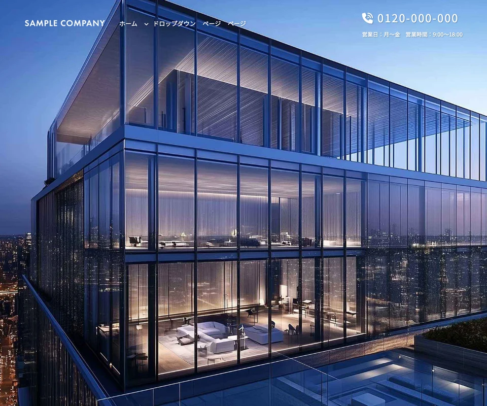 メイン画像は動画。企業サイト向けのベーシックな構成です。ダークモード。