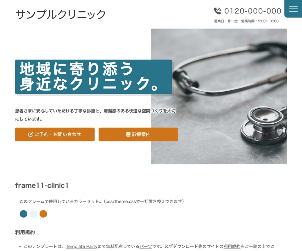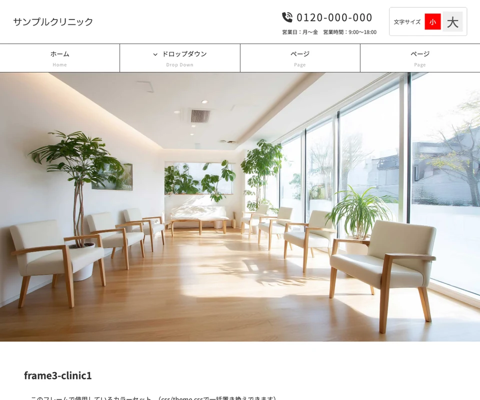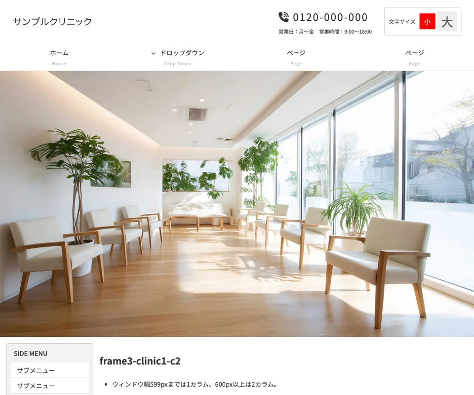 メイン画像は静止画。文字サイズ変更ボタンつき。医療・クリニック向けの清潔感のある構成です。