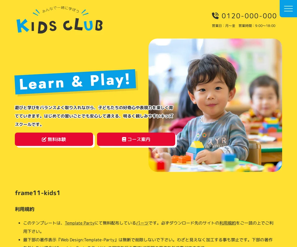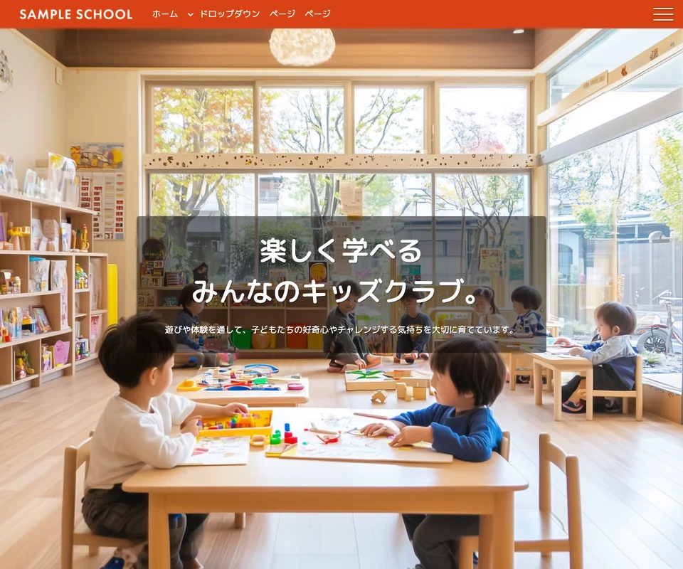 メイン画像はスライド(ズーム)。キッズスクール・子供向けのポップな構成です。