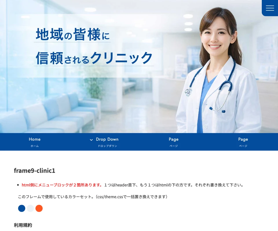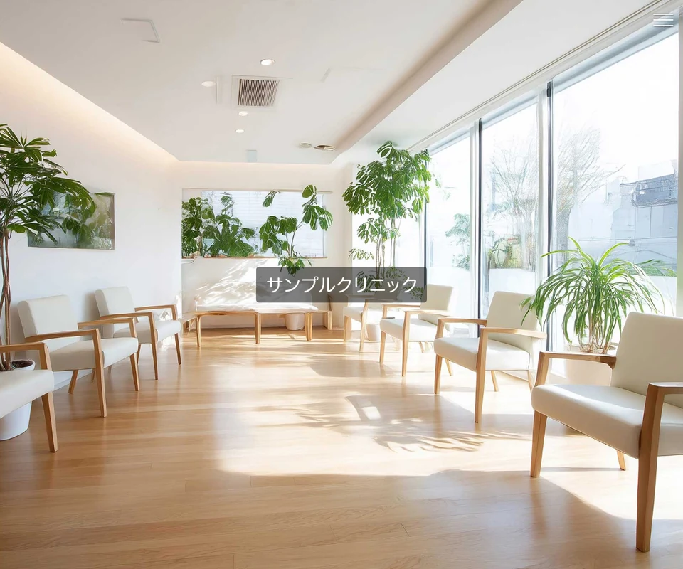 メイン画像は静止画。医療・クリニック向けの清潔感のある構成です。 メニューは開閉タイプです。