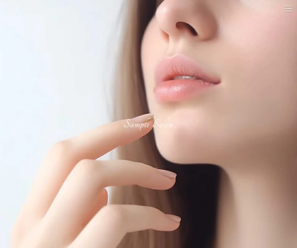 メイン画像は静止画。ロゴが天地左右の中央に配置。メニューは開閉タイプです。エステ・美容向けのやさしい構成です。