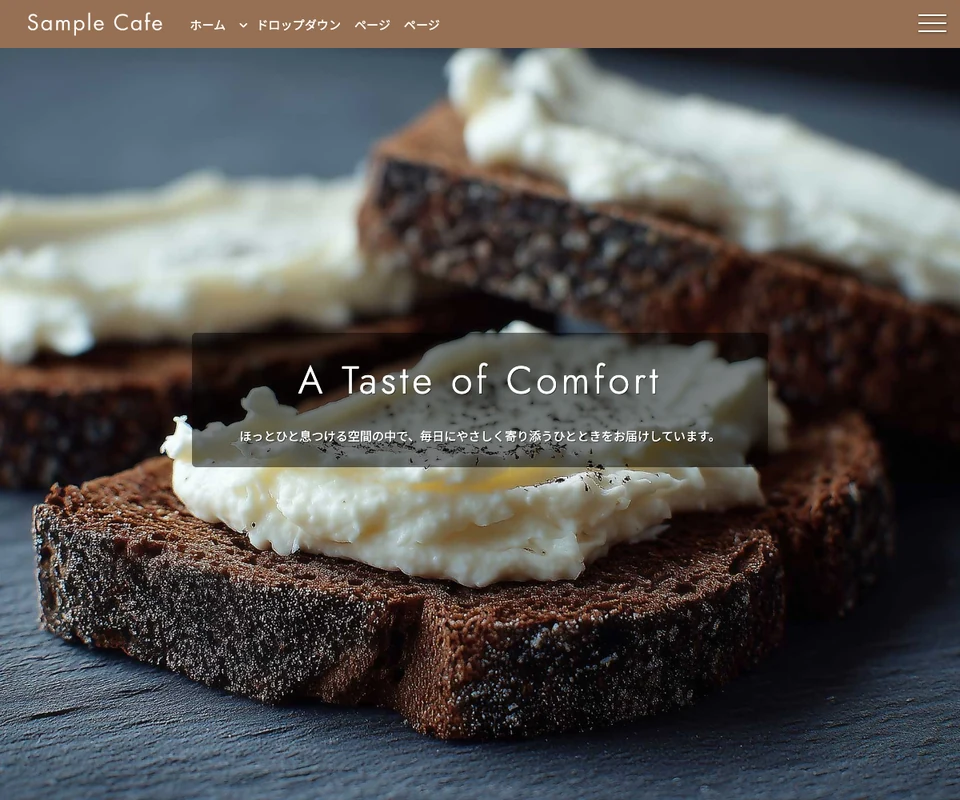 メイン画像はスライドショー(ズーム)。ヘッダー横メニューと開閉メニューが独立しています。カフェなどの飲食店向け。