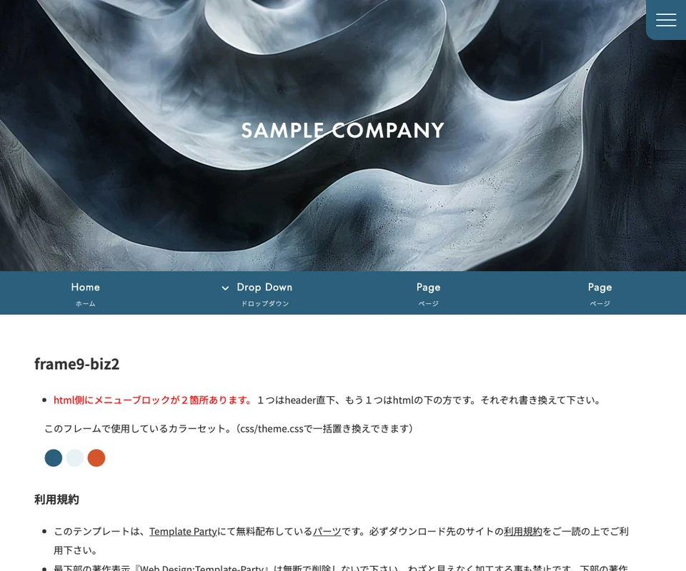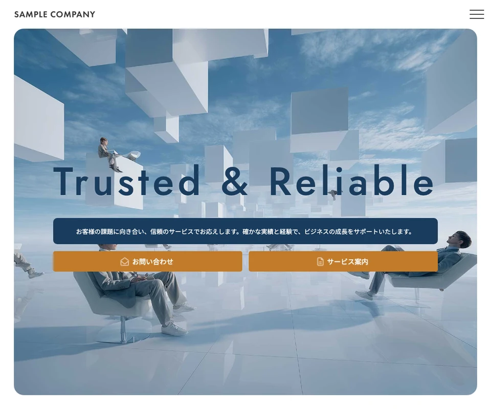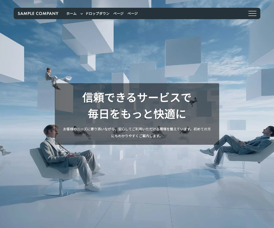 メイン画像はスライドショー。ロゴが天地左右の中央に配置。メニューは開閉タイプです。企業サイト向けのベーシックな構成です。