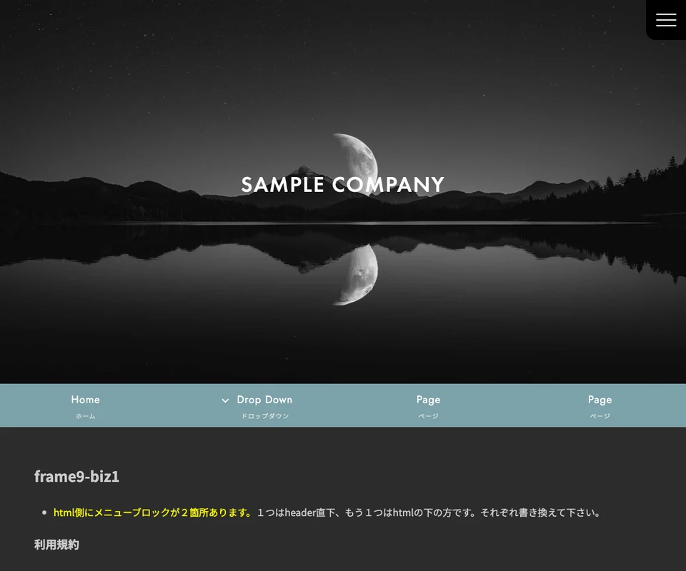 メイン画像はスライド(フェード)。企業サイト向けのベーシックな構成です。ダークモード。