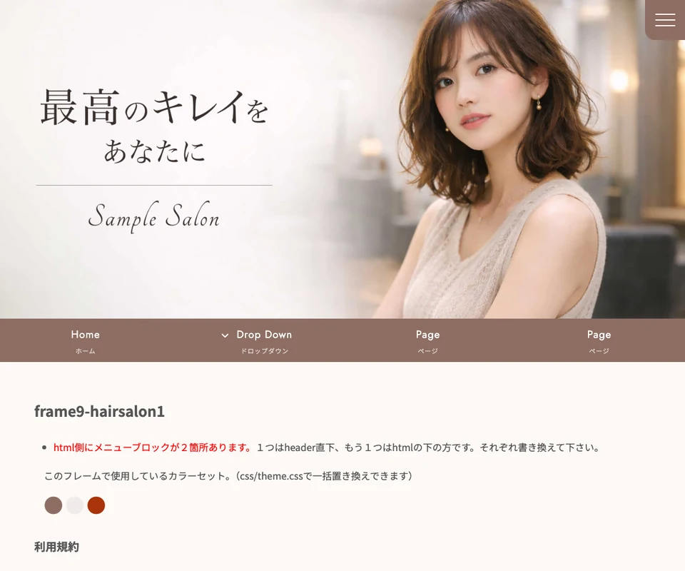 メイン画像はスライドショー。ヘアサロン・美容室向け。メニューは開閉タイプです。