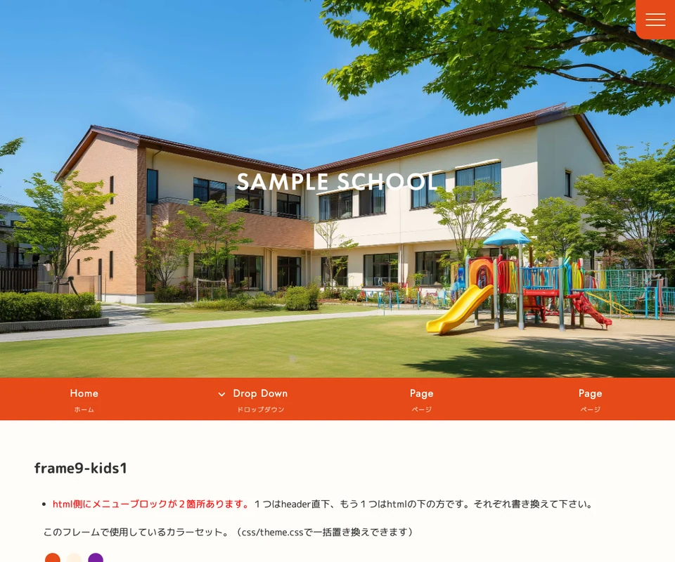 メイン画像はズーム型スライドショー。子供・スクール向けのポップな構成です。 メニューは開閉タイプです。