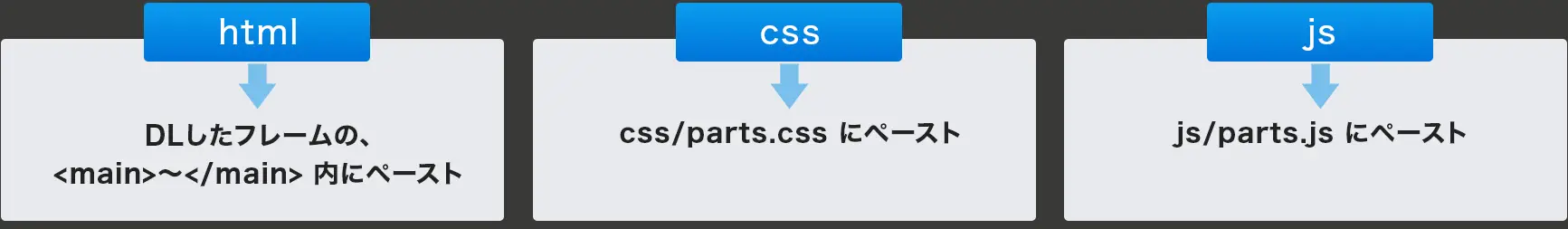 htmlボタンはDLしたフレームの html の main 内に、cssボタンは css/parts.css に、jsボタンは js/parts.js にペーストして下さい。