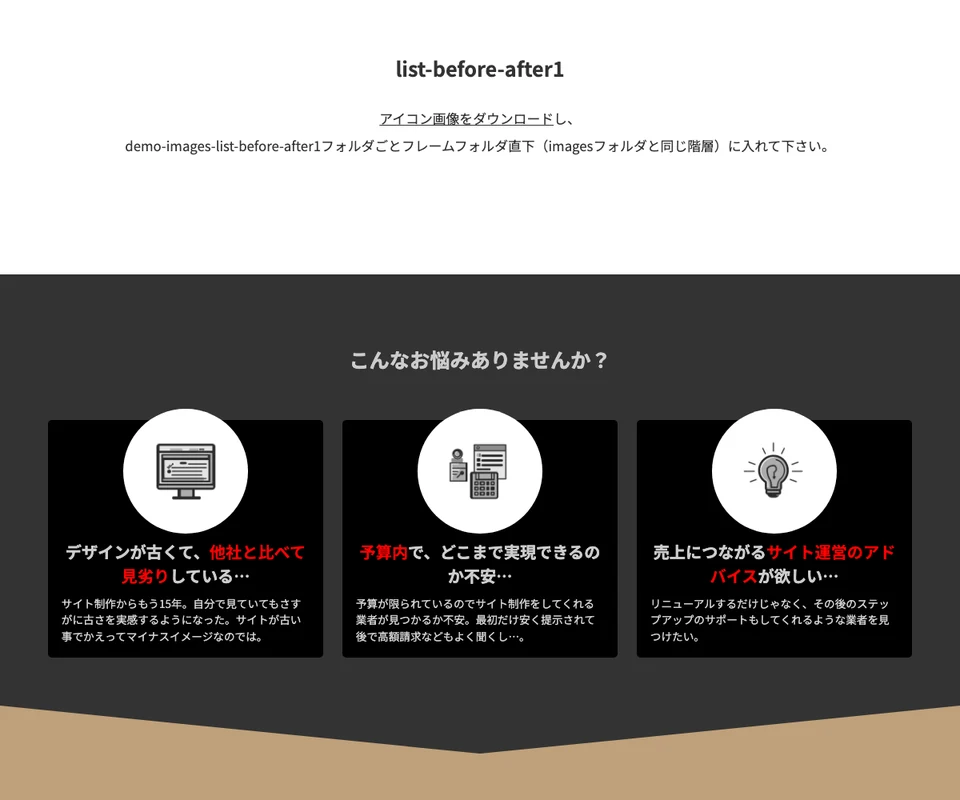 アイコン画像を先にDLし、demo-images-list-before-after1フォルダごとフレームフォルダ直下(imagesフォルダと同じ階層)に入れて下さい。
