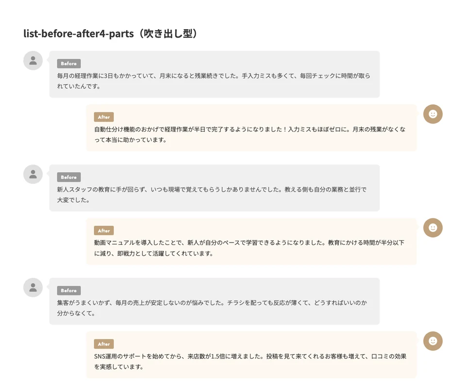 吹き出しタイプのビフォーアフターパーツです。お客様の声やFaqに。