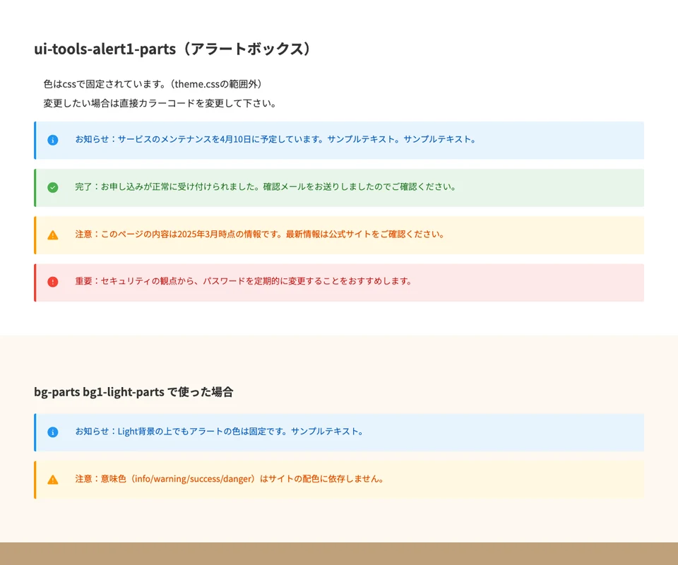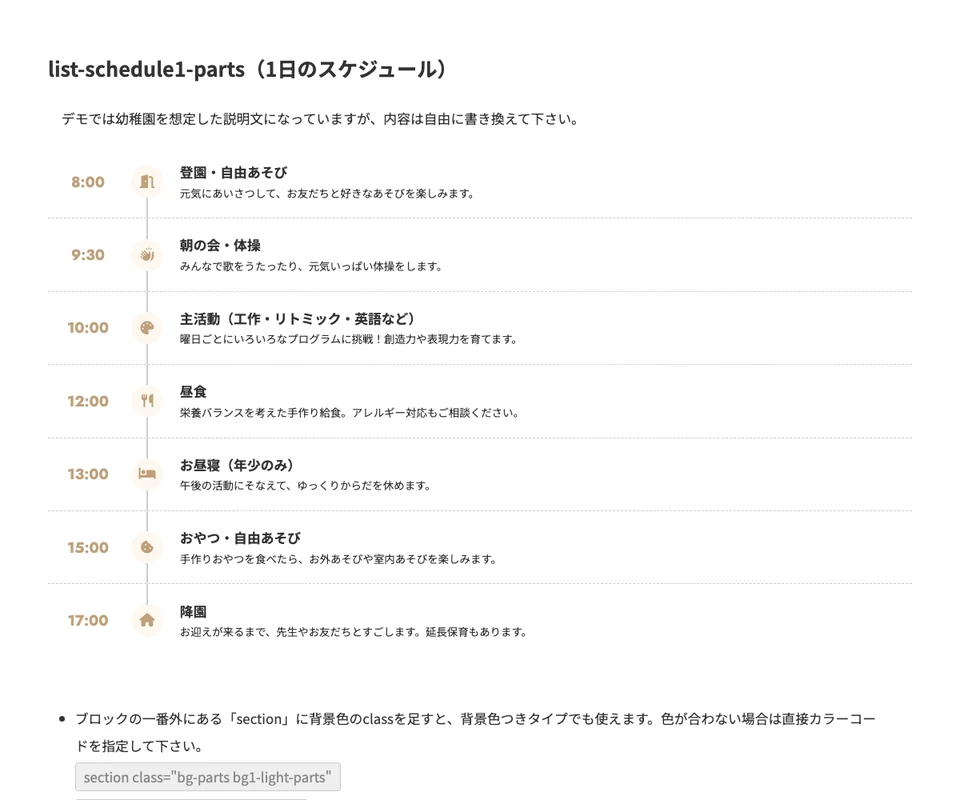 デモでは幼稚園を想定した説明文になっていますが、内容は自由に書き換えて下さい。アイコンはFont Awesomeで入れ替えできます。