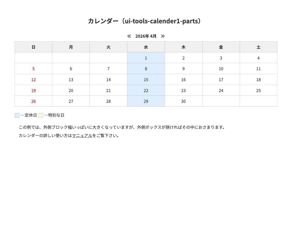 カレンダーです。カレンダーの設定はjsで、レイアウトはcssで調整。