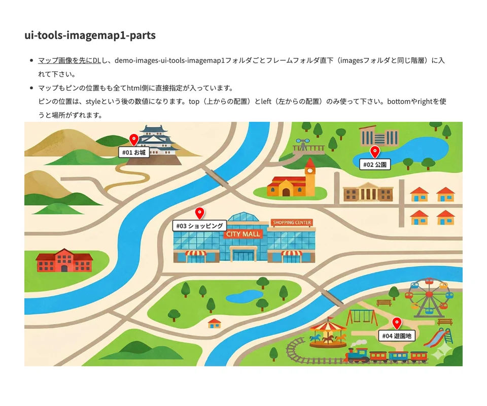 マップ画像を先にDLし、demo-images-ui-tools-imagemap1フォルダごとフレームフォルダ直下(imagesフォルダと同じ階層)に入れて下さい。地図の上の任意の場所にアイコンを重ねたタイプ。