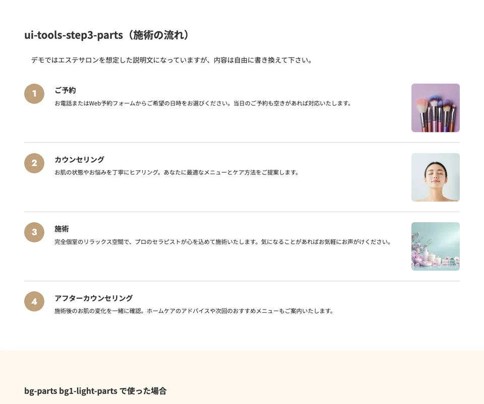スクロール中、画像ブロックがフェードで入れ替わります。ステップ案内などにも。