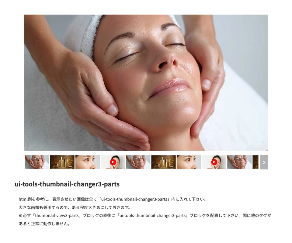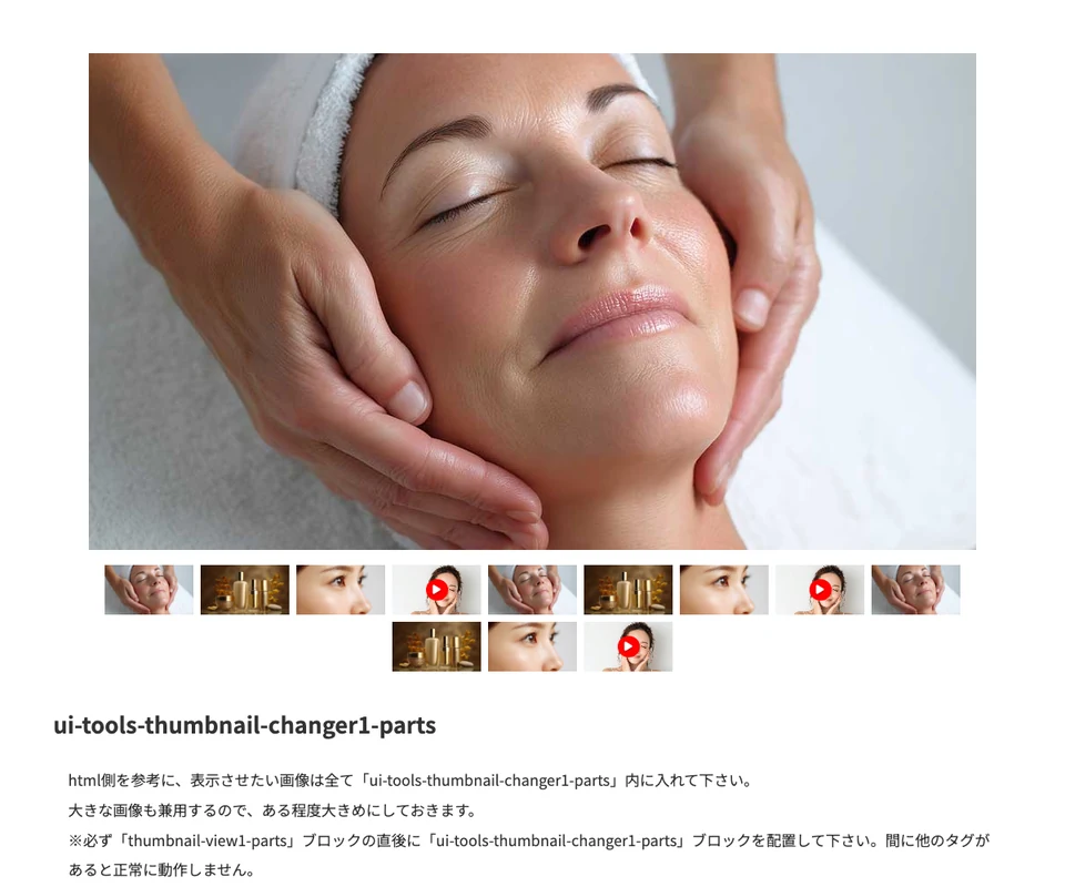 複数のサムネイルが並んでいて、クリックすると、メイン画像が入れ替わります。静止画・動画に対応。