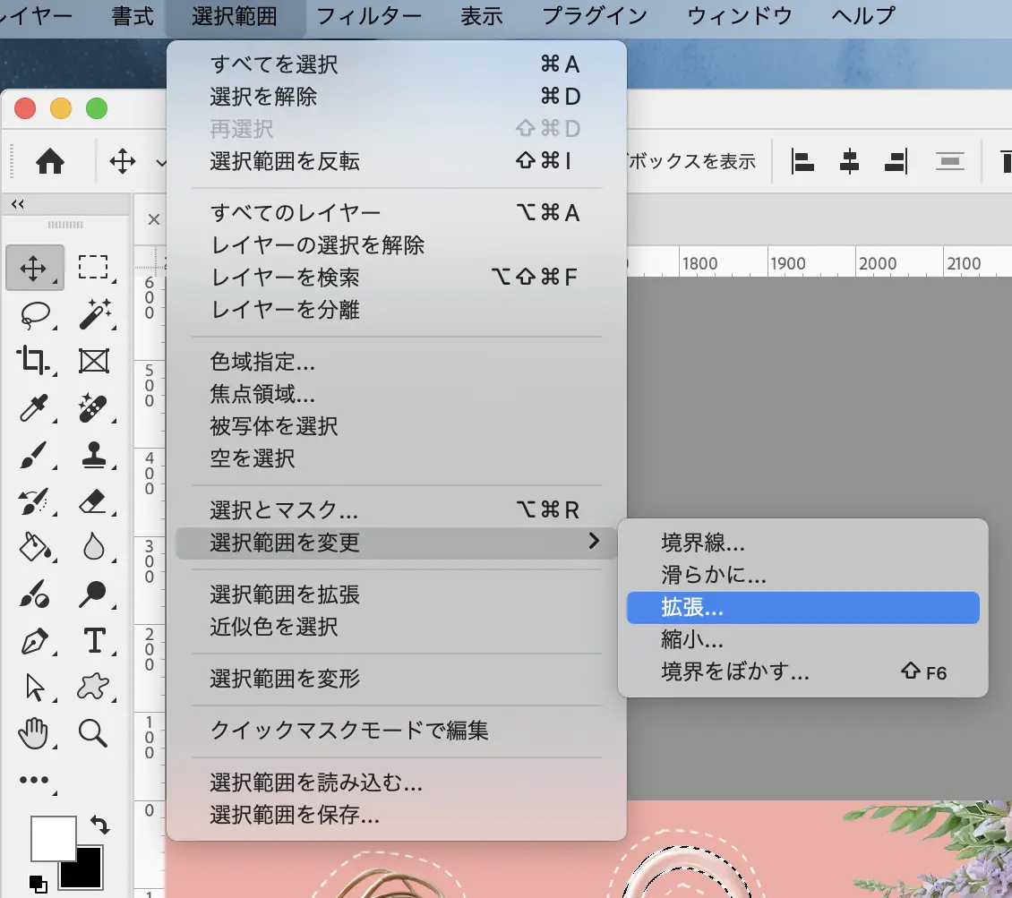 「選択範囲」→「選択範囲を変更」→「拡張」を選びます。