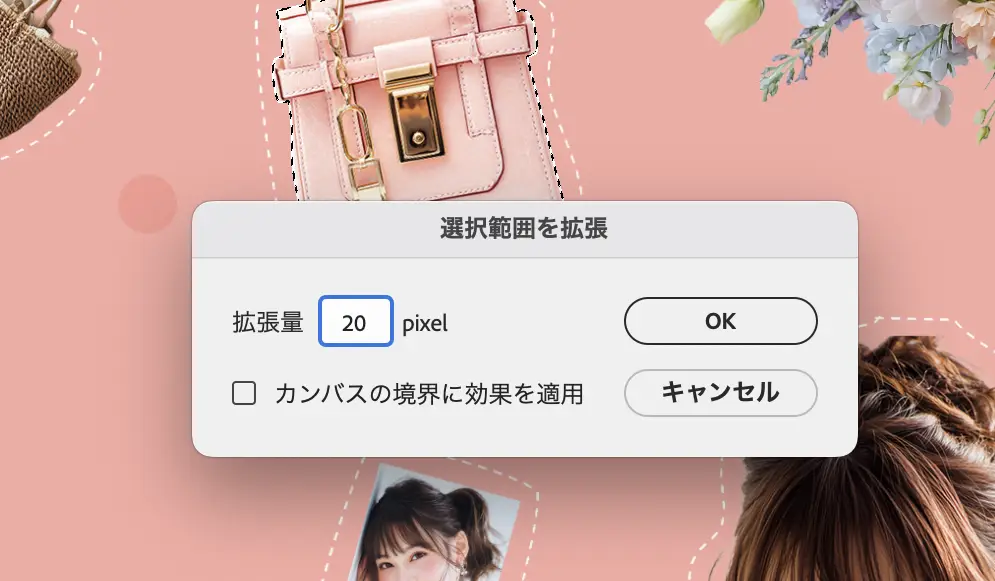もしも入っていない場合は、ブラシパネル右上のメニュー(≡)→「ブラシを読み込む」から読み込んでみて下さい。 - 点線を追加したい画像の選択範囲を作り、