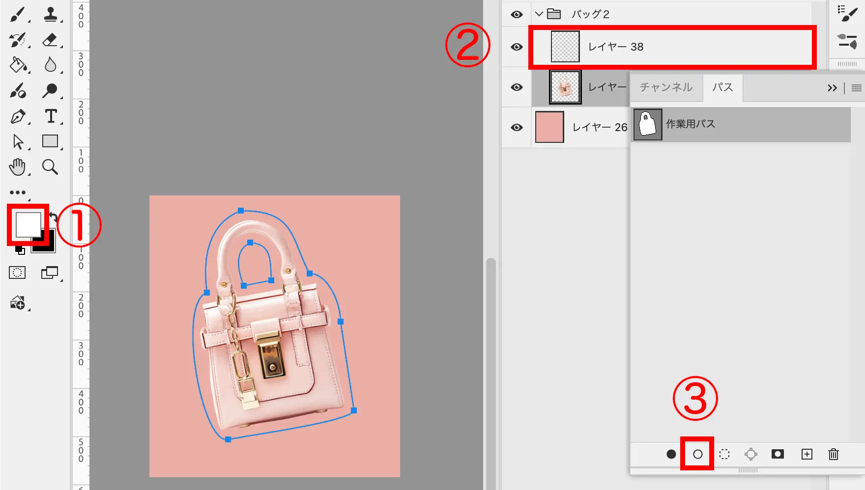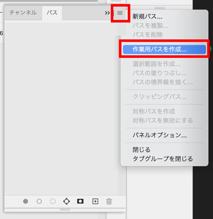 - パスパネルを開いて、右上のメニュー(≡)→「作業用パスを作成」を選択。